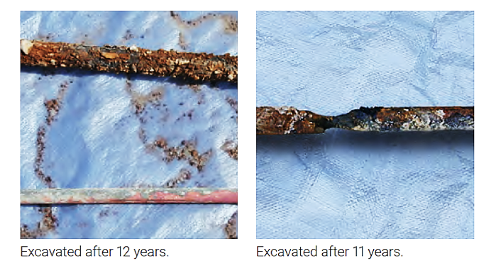 The photo on the right shows a galvanized steel ground rod driven vertically into the ground at the Pawnee testing site in Las Vegas, NV. One area is reduced from a 3/4″ diameter to approximately a 1/4″ diameter due to extensive corrosion. The eventual failure would result in a potentially catastrophic loss of ground.