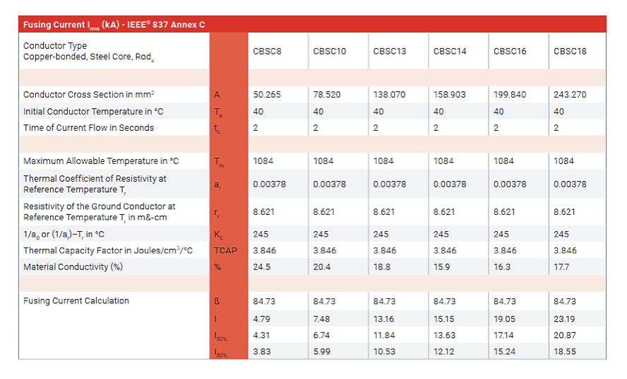 The IEEE 837 standard (Annex C) provides a method of calculating the fusing current for conductors. The following chart is a reference of the calculations for copper-bonded steel conductor according to the IEEE 837 standard.