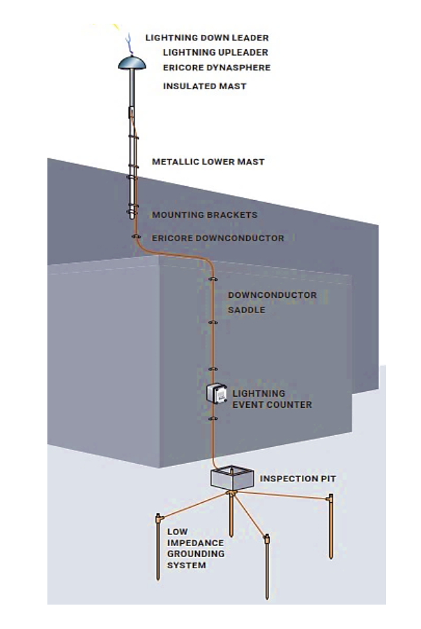 As an integral part of the System 3000, multi-layered, low impedance insulated Ericore downconductor conveys the lightning discharge current to ground with minimal danger of sideflashing. A unique semi-conductive outer sheath allows electrostatic bonding of the building through cable securing saddles.