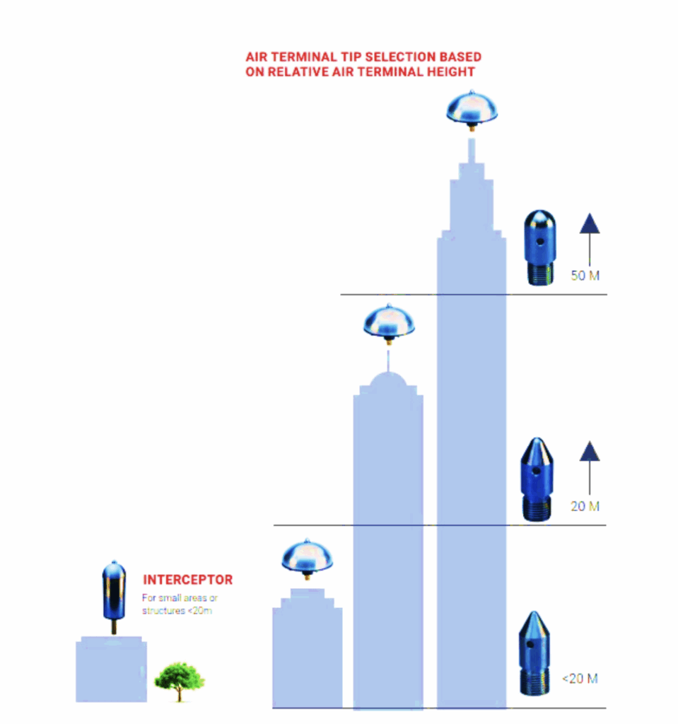 Air Terminal tips are provided that optimize performance for the relative height of the installation, and are also easily replaced in the event they become damaged from excessive strike in extremely volatile locations.